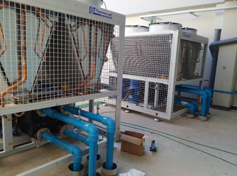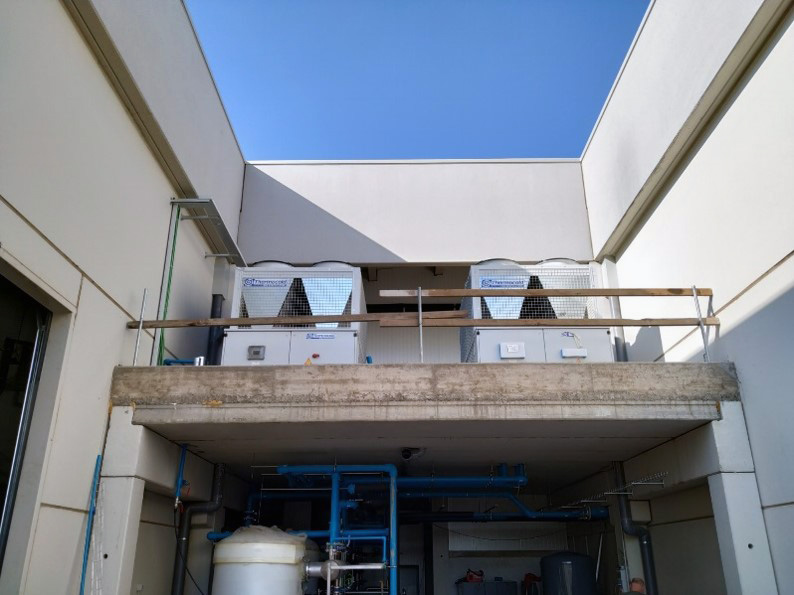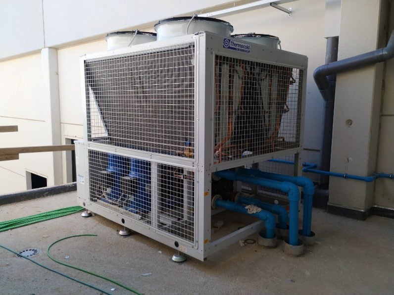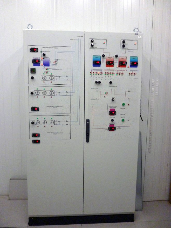 Equipos frigoríficos con recuperación de calor, para producir agua caliente a la vez que se enfría, de forma que toda el agua que se produce es gratuita + Cuadro eléctrico de control de la instalación de frío y calor, así como de los diferentes grupos de bombeo.